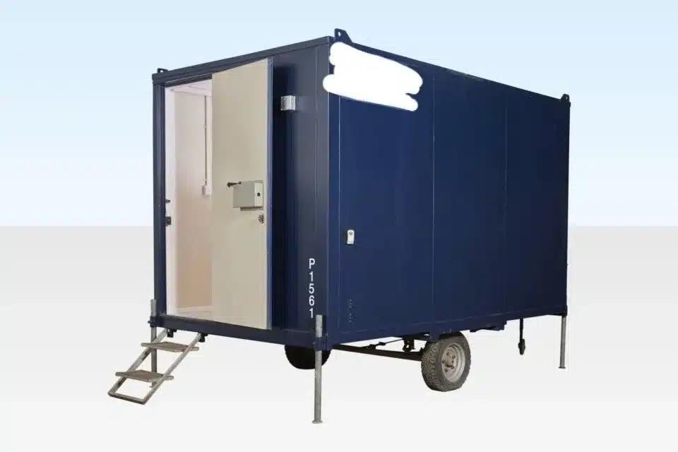 A secure steel wheeled mobile office unit, ideal for the provision of easily movable office and meeting space- especially useful for project management on transient sites such as roads and pipeline related works, as well as sites with limited access for delivery of conventional cabins by lorry.